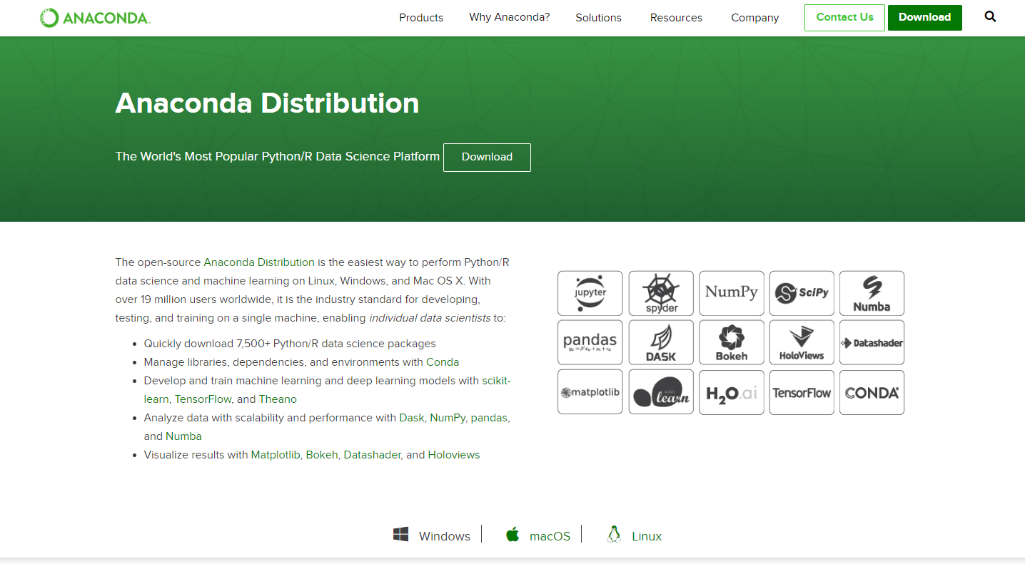 Anaconda Distribution is the world's most popular Python data science platform. Download the free version to access over 1500 data science packages and manage libraries and dependencies with Conda.