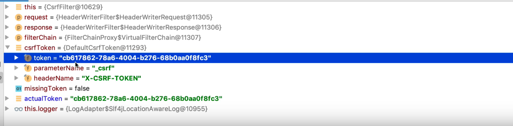 그러면 우리의 csrfToken 값과 actualToken 값이 일치하는지 여부를 확인할 수 있다.