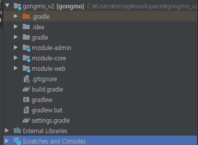 위와 같이 admin, core, web 으로 3개의 멀티모듈로 구성하였다.