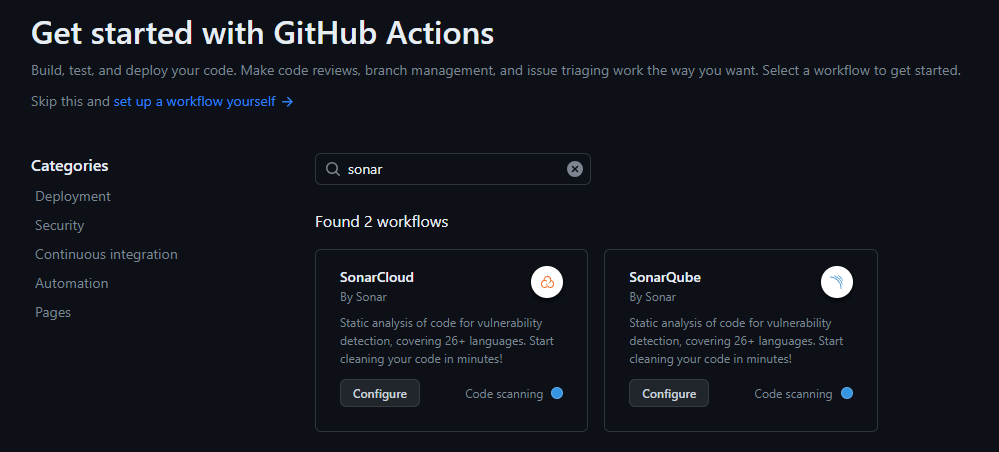 실제 깃허브에서도 Github Actions 을 만들 때 sonarqube 에 대한 템플릿을 제공하고 있습니다.
