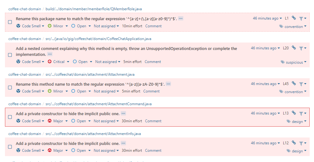 - 아래 코드 예시처럼 Dto 를 사용하기 위해 생성자를 명시하지 않은 경우도 CodeSmell 로 알려주고 있습니다. 하나의 클래스 안에는 private 생성자를 만들기를 권장하네요.