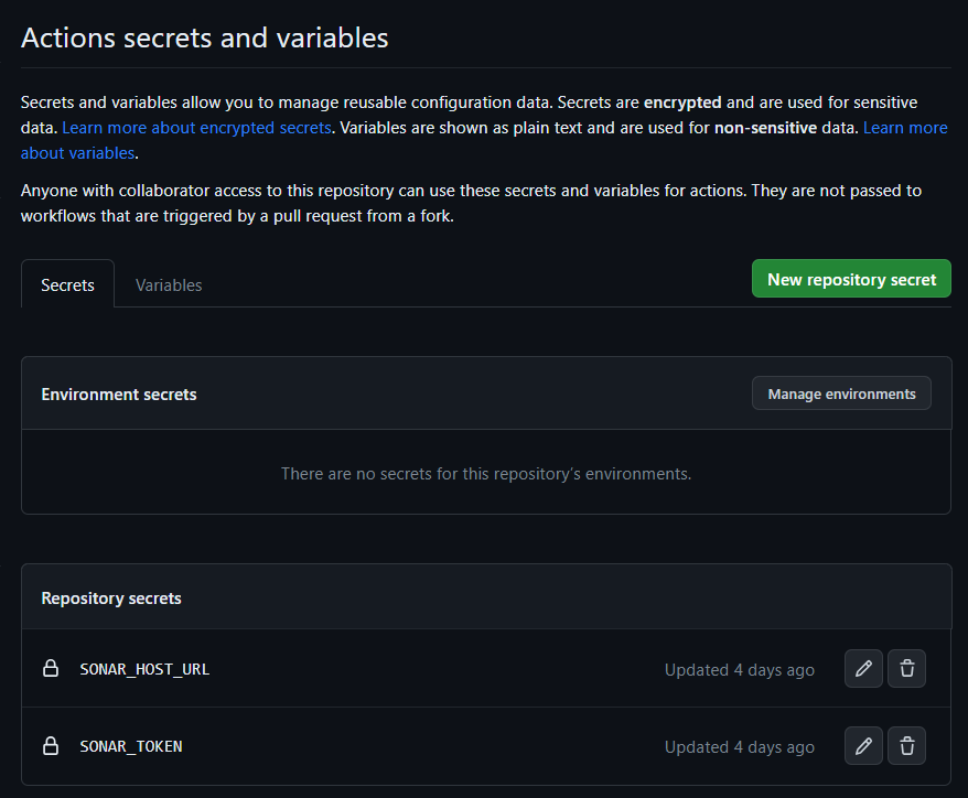 - SONAR_TOKEN 과 SONAR_HOST_URL 은 Repository → Settings → Secrets and variables → Actions 메뉴에서 설정할 수 있습니다.