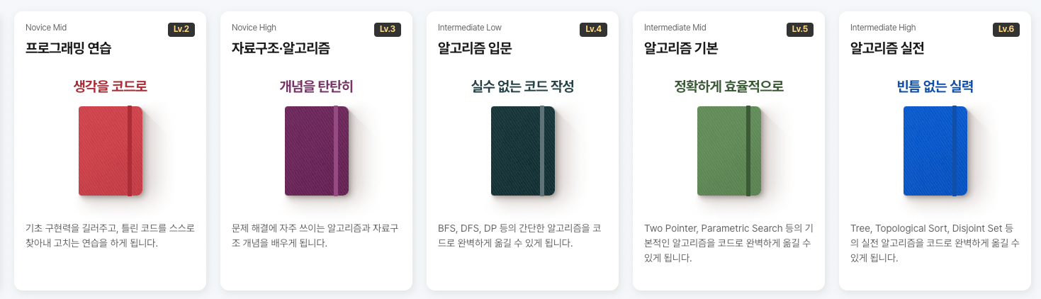 코드트리의 경우 프로그래밍 커리큘럼을 위와 같이 구분하였다. 먼저 프로그래밍 기초 (C, C++ ,Python, Java) 를 지원하여 코딩 테스트 문제를 푸는데 필요한 언어의 용법적 지식을 습득할 수 있는 과정이다. 프로그래밍 연습 같은 경우는 NOVICE LOW, MID, HIGH 로 구분되어진다. LOW 는 맨 처음 문제를 푸는 습관을 들이기 시작할 때에는 이만한 과정이 없는 것 같다. 난이도 자체는 쉬운 편이고, 내가 주력으로 사용하는 언어라면 문제를 풀어가면서 워밍업 해볼 수 있는 과정이다.