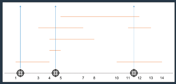 요격시스템에서는 A나라가 발사한 미사일의 좌표 배열 targets 배열을 좌표의 끝점을 기준으로 정렬을 하였습니다. 우리는 targets 를 순회하면서 조건을 검사할 수 있는 단계들을 설정하였습니다.