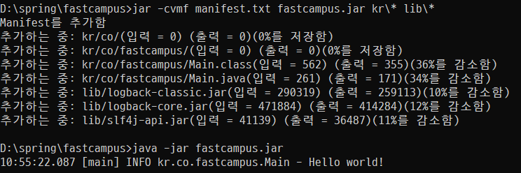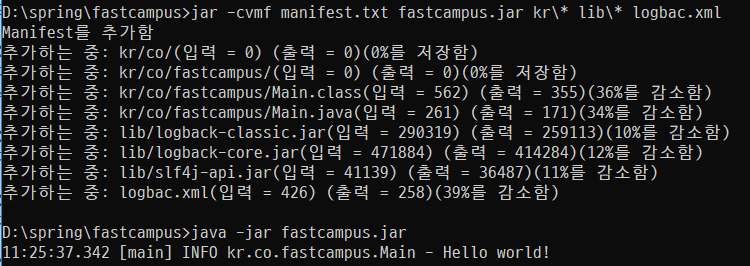 jar -c -m manifest.txt -f fastcampus.jar.kr\* 로 jar파일 생성