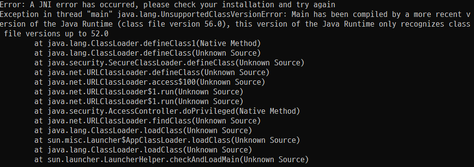 에러를 해석해보면, 컴파일할 때에는 version 56.0 인데, 실행 할때는 version 52.0 까지만 가능해서 실행이 안된다.