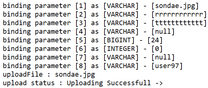 - 콘솔창을 통해 쿼리와 파라미터 값이 정상적으로 동작했음을 알 수 있다.